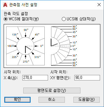 뷰 방향을 표준 좌표계(WCS) 또는 사용자 좌표계(UCS)를 기준으로 설정합니다.