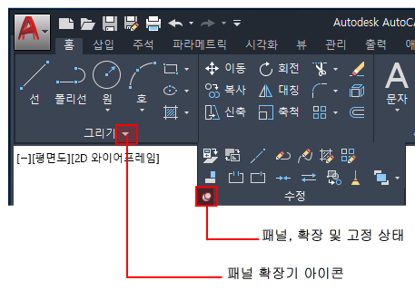 패널을 리본 탭에서 끌어내어 도면 영역이나 다른 모니터에 놓을 수 있습니다. 리본 탭을 전환하는 경우에도 부동 패널은 다시 리본에 배치될 때까지 열린 상태로 유지됩니다.