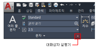 일부 리본 패널에서는 해당 패널과 관련된 대화상자에 액세스할 수 있습니다. 관련 대화상자를 표시하려면 패널의 오른쪽 아래 구석에 있는 대화상자 실행기(화살표 아이콘 으로 표시됨)를 클릭합니다.
