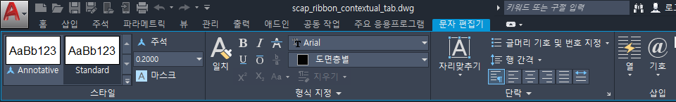 특정 객체 유형을 선택하거나 특정 명령을 시작하면 도구막대 또는 대화상자 대신 상황별 리본 탭이 표시됩니다. 상황별 탭은 명령을 종료하면 닫힙니다.