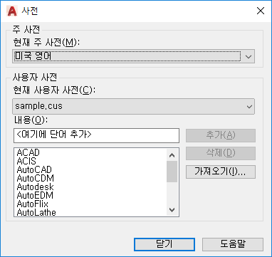 현재 사용자 사전의 이름을 표시합니다. .cus 확장자는 AutoCAD 사용자 사전에 사용됩니다.