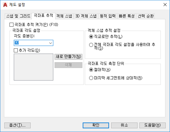 극좌표 추적에 사용할 수 있는 각도를 리스트에 추가로 만듭니다. (POLARMODE 및 POLARADDANG 시스템 변수)