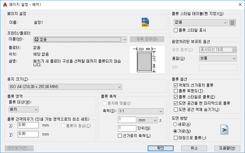 지정하는 페이지 설정 설정은 배치와 함께 저장되며 다른 배치에 적용하거나 또는 다른 도면으로 가져올 수 있습니다.