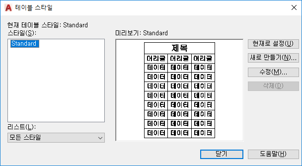 스타일 리스트에서 선택된 테이블 스타일을 삭제합니다. 도면에서 사용 중인 스타일을 삭제할 수 없습니다.
