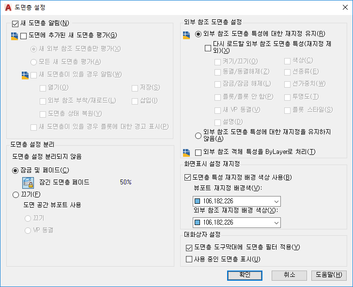 새 도면층에 대해 알림이 수행되는 시기, 일부 도면층이 격리된 경우의 도면층 동작, 도면층 필터가 도면층 도구막대에 적용되는지 여부, 그리고 도면층 특성 관리자에서 뷰포트 재지정의 배경 색상을 조정합니다.