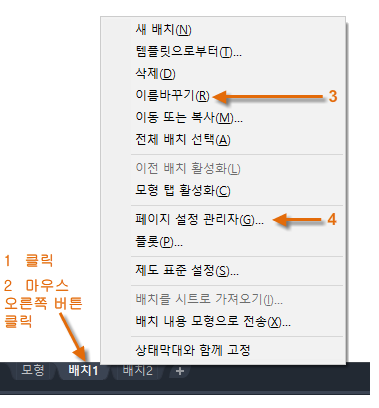 배치 탭에 액세스할 때는 먼저 (1) 해당 탭을 마우스 오른쪽 버튼으로 클릭한 다음 (2) 탭 이름을 (3) 배치 1보다 구체적인 이름으로 바꿔야 합니다. D-크기 배치의 경우 ARCH D 또는 ANSI D가 좋은 선택일 수 있습니다.