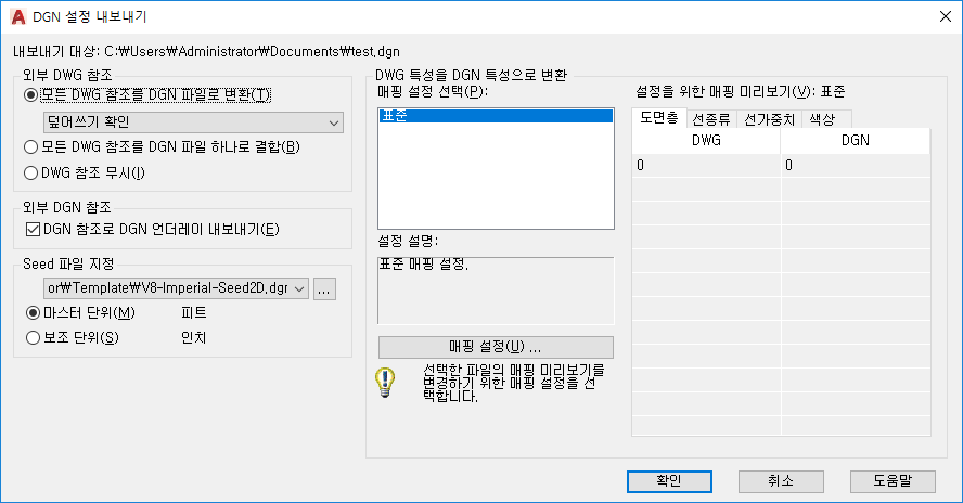 표준은 내보낼 도면에서 데이터를 추출하고, 매핑 미리보기에 표시된 대로 DGN 도면층, 선종류, 선가중치, 색상에 자동 매핑을 적용하는 기본 매핑 설정입니다.