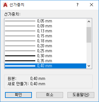 이전 선가중치를 표시합니다. 도면층이 작성될 경우 지정되는 기본 선가중치는 DEFAULT입니다(기본값인 0.01인치 또는 0.25mm로 플롯). (LWDEFAULT 시스템 변수)