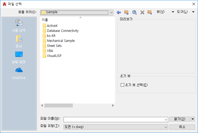 미리보기를 선택하면 선택한 파일의 비트맵이 표시됩니다. 도면 파일과 함께 비트맵을 저장하려면, 옵션 대화상자의 열기 및 저장 탭에서 썸네일 미리보기 이미지 저장 옵션을 사용합니다.
