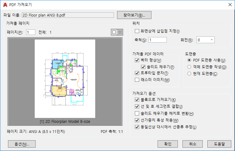 지정한 PDF 파일 페이지에서 형상, 채우기, 래스터 이미지 및 트루타입 문자 객체를 가져오기 위한 옵션을 설정합니다.