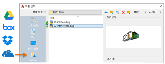 클라우드 저장소 공급자 계정이 있는 경우 AutoCAD 파일 선택 대화상자의 환경 막대에 추가하여 클라우드 저장소 계정의 도면을 직접 탐색할 수 있습니다. 환경 막대 내부를 마우스 오른쪽 버튼으로 클릭하고 탐색 바로 가기의 이름 및 경로를 입력하기만 하면 됩니다.