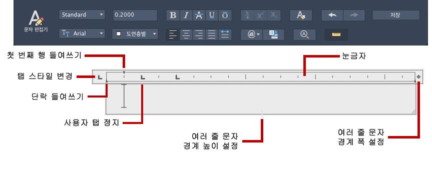 여러 줄 문자 객체에 대한 정렬을 설정합니다. 문자를 왼쪽, 중앙 또는 오른쪽으로 정렬하도록 선택할 수 있습니다. 문자의 자리를 맞추거나, 문자의 첫 번째와 마지막 글자를 mtext 상자의 여백에 맞춰 정렬하거나, 문자의 각 줄이 mtext 상자 여백 내에서 중앙에 오도록 할 수 있습니다. 행 끝에 입력된 빈 칸은 문자의 일부로 포함되어 행의 자리맞추기에 영향을 줍니다. (단일 행 문자에 대해서는 사용할 수 없습니다.)