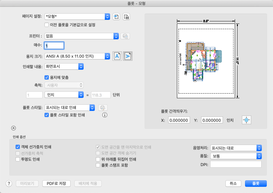 용지 크기, 플롯 영역, 플롯 축척, 방향 및 기타 옵션을 선택합니다.