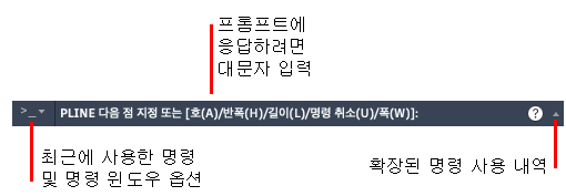 명령을 입력하고 나면 명령행에 일련의 프롬프트가 표시될 수 있습니다. 예를 들어, PLINE을 입력하고 첫 번째 프롬프트를 지정하고 나면 다음과 같은 프롬프트가 표시됩니다.