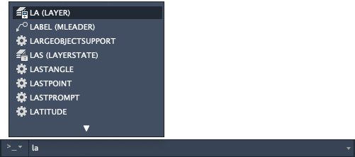 일부 명령에는 명령행에서 입력할 수 있는 약어 이름, 즉 명령 별칭이 있습니다. 예를 들어, circle을 입력하여 CIRCLE 명령을 시작하는 대신 c를 입력하고 Enter 키를 누르면 됩니다. 명령 제안 사항 리스트(표시되는 경우)에서 명령 이름 앞에 별칭이 표시됩니다. C(CIRCLE)