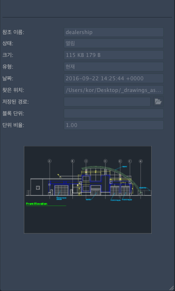 참조 관리자 팔레트 아래에 있는 상세 정보 및 미리보기 패널에는 선택한 파일 참조에 대한 정보가 표시됩니다.