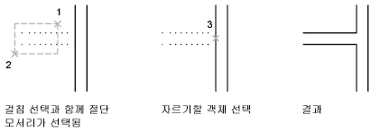 다른 객체와 가장 가까운 교차점에 맞추어 객체를 자를 수 있습니다. 절단 모서리를 선택하는 대신 Enter 키를 누릅니다. 그런 다음, 자를 객체를 선택하면 표시된 객체 중 가장 가까운 객체가 절단 모서리 역할을 합니다. 다음 예제에서는 벽이 부드럽게 교차하도록 잘립니다.