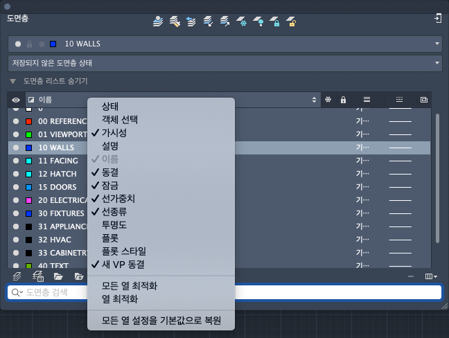 - 도면층 리스트에서 열 제목 표시를 전환하고, 전체 열 또는 선택한 열의 크기를 최대 폭으로 자동으로 조정하는 옵션을 제공합니다.