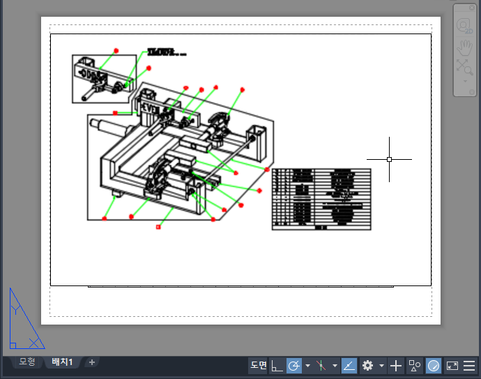 작업 환경에는 "모형 공간"과 "도면 공간"의 두 가지가 있으며, 이 두 공간에서 도면의 객체로 작업을 할 수 있습니다.