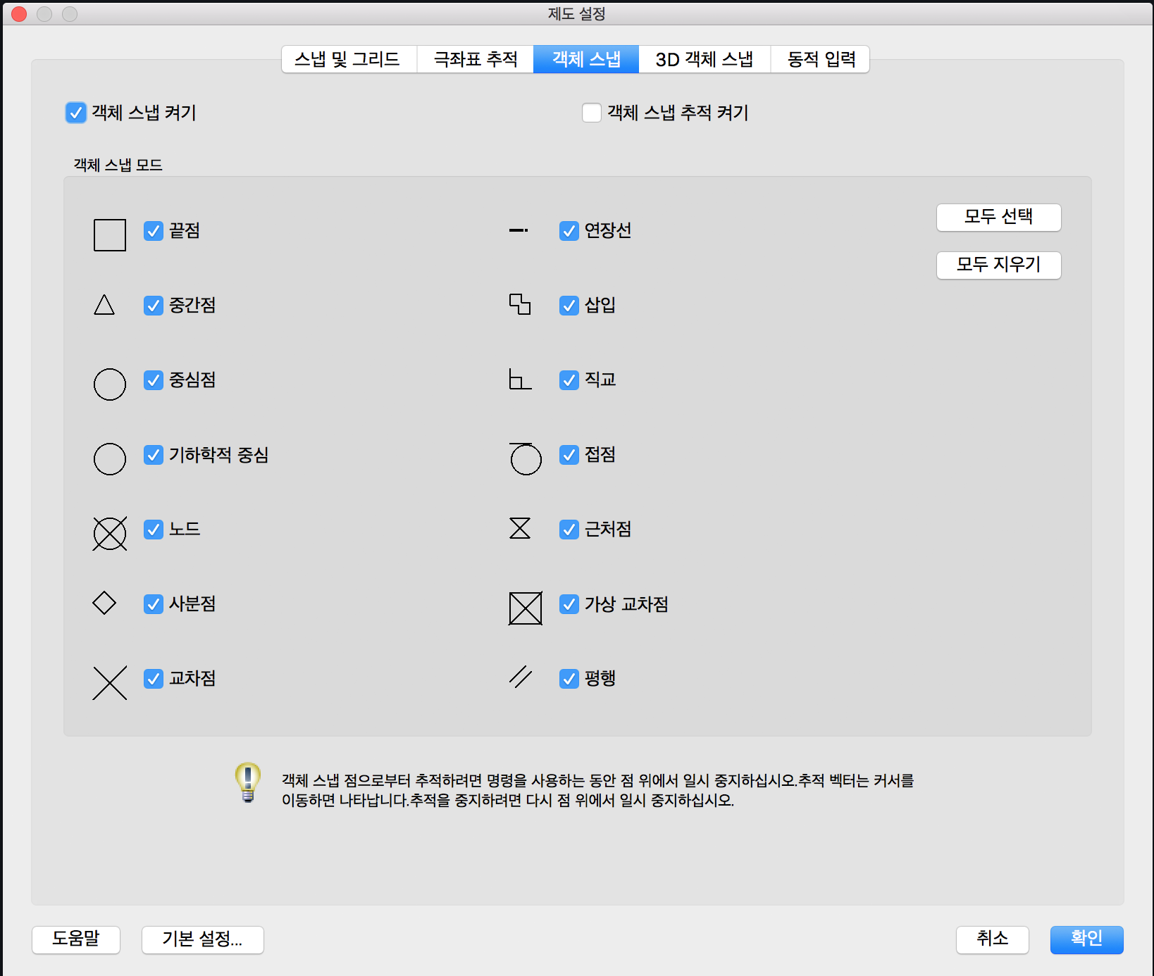 실행 중인 객체가 스냅될 때 설정할 수 있는 객체 스냅을 나열합니다.