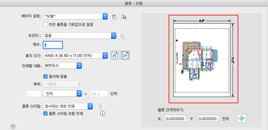 미리보기 영역을 통해 플롯할 때 도면이 나타나는 방식을 쉽게 확인할 수 있습니다.