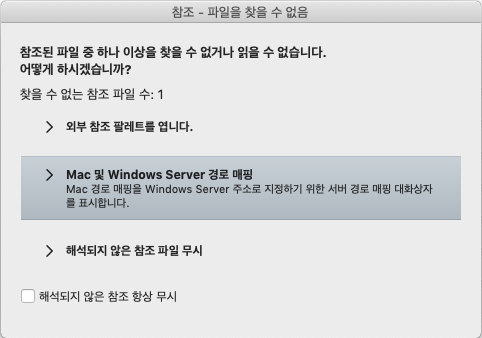 주 도면이 로컬 컴퓨터에 있고 참조가 서버에 있는 경우 서버 경로 매핑 대화상자를 사용하여 참조를 해석해야 합니다.