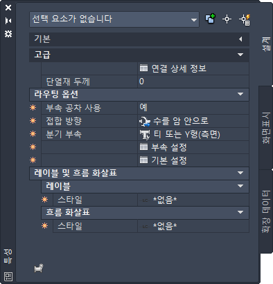 특성 팔레트의 설계 탭에서 파이프 객체를 추가하는 데 사용할 수 있는 특성입니다.