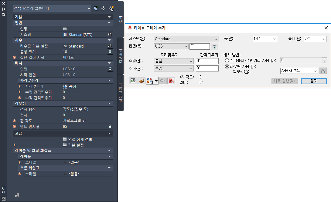 2. 나머지 단계에서는 전선관 설정에 대해서는 특성 팔레트를 사용하고 케이블 트레이 설정에 대해서는 케이블 트레이 추가 대화상자를 사용합니다(다음 그림 참고).
