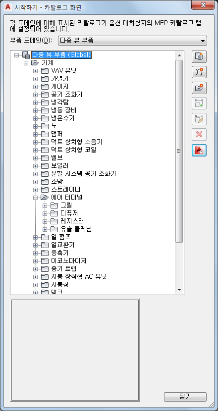 컨텐츠 작성기를 시작하면 시작하기 - 카탈로그 화면 대화상자가 표시됩니다. 이 작업 관련 대화상자는 전환 역할을 하므로 여러 작업 환경에 신속하게 액세스할 수 있습니다. 시작하기 - 카탈로그 화면 대화상자에는 부품 카탈로그 브라우저와 아이콘 막대가 있습니다. 옵션 대화상자의 MEP 카탈로그 탭에서 지정한 로드된 부품 카탈로그 리스트에서 카탈로그를 선택합니다. 부품 카탈로그 및 부품이 카탈로그에 저장되는 방법에 대한 자세한 내용은 부품 카탈로그 주요 사항을 참고하십시오.