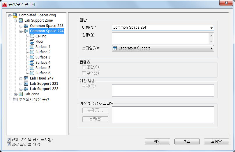 공간/구역 관리자를 사용하여 구역 계층 구조를 검토하고 표면 및 개구부 유형과 같은 공간 정보를 검토할 수 있습니다.