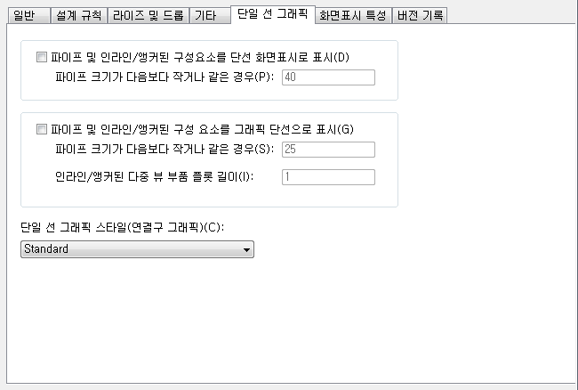 8. 단일 선 그래픽 탭에서 파이프 및 인라인/앵커된 구성요소를 단선 화면표시로 표시를 선택합니다.