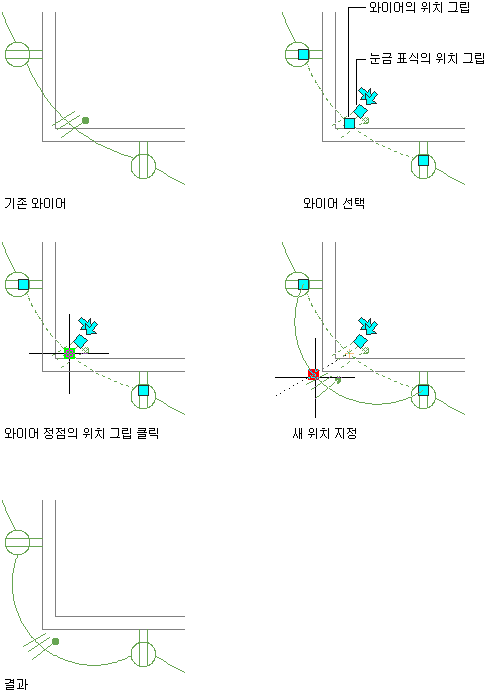 위치 그립을 사용하여 정점을 이동해서 와이어의 배치를 수정할 수 있습니다. 벽, 장비 또는 다른 바닥 평면도 형상 주위로 와이어를 이동하여 배치를 마무리하려는 경우에 유용합니다.