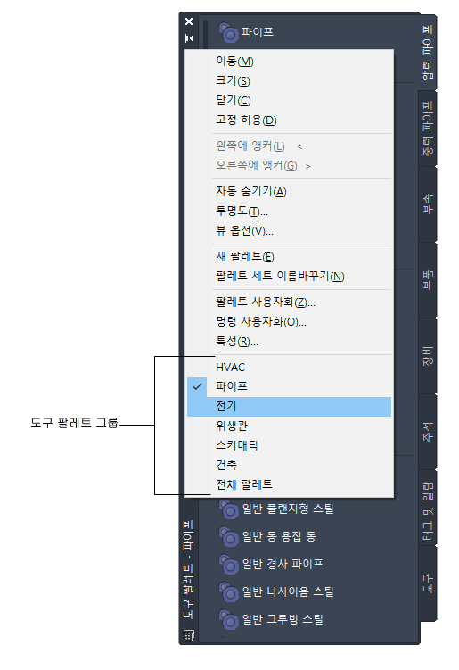 2. 상황에 맞는 메뉴에서 표시할 도구 팔레트 그룹을 선택합니다.