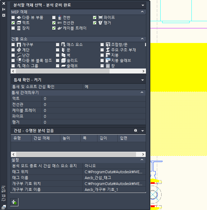 주: 간섭 분석 모드가 도면 단위로 작동합니다. 다른 도면으로 전환하는 경우에는 현재 활성화된 도면을 기반으로 간섭 탐지 팔레트가 업데이트됩니다.