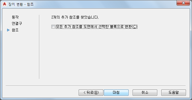 현재 도면이나 참조된 도면(외부 참조) 중 하나에서 블록이나 부품을 선택할 수 있습니다.