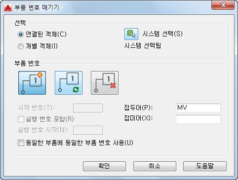 - 동일한 부품에 동일한 부품 번호 사용을 클릭하여 이 옵션을 설정하거나 취소합니다.