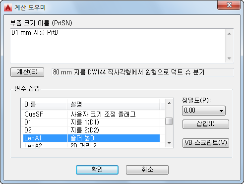 - 계산 도우미 대화상자에서 부품 크기 이름을 정의합니다.