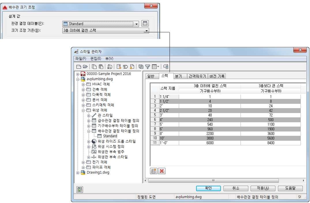 배수 런을 3층 이하에 걸친 스택 또는 4층 이상에 걸친 스택으로 정의하면 위생 모듈에서 배수관경 결정 테이블(관경 결정 테이블)의 스택 탭에 있는 정보를 사용하여 크기 조정 계산을 수행합니다. 이 배수관경 결정 테이블의 정의는 스타일 관리자에서 확인할 수 있습니다.