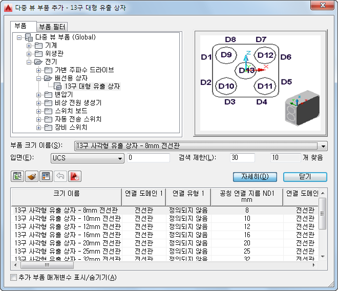 또한 다중 뷰 부품 추가 대화상자 및 다중 뷰 부품 수정 대화상자에서 부품 필터 탭을 사용하여 특정 부품 크기를 찾기 위해 부품 패밀리를 조회할 부품 특성을 지정할 수 있습니다. 자세히를 클릭하여 부품 패밀리에서 사용할 수 있는 부품 크기를 볼 수 있습니다. 사용 가능한 부품 크기는 탐색하기 쉬운 부품 크기 테이블에 표시됩니다. 테이블에 모든 매개변수를 표시하려면 추가 부품 매개변수 표시/숨기기를 선택합니다.