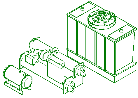 연관 보일러, 원심 냉온수기 및 냉각탑(왼쪽에서 오른쪽)