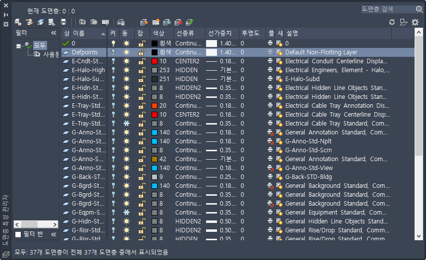 도면층 특성 관리자를 사용하면 현재 도면에서 도면층을 보고 관리할 수 있습니다.