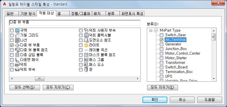 소프트웨어에 있는 대부분의 장비가 다중 뷰 부품이므로 원하는 부품 유형의 데이터로만 일람표 테이블이 채워지도록 분류를 사용하는 장비 일람표 스타일이 많습니다.