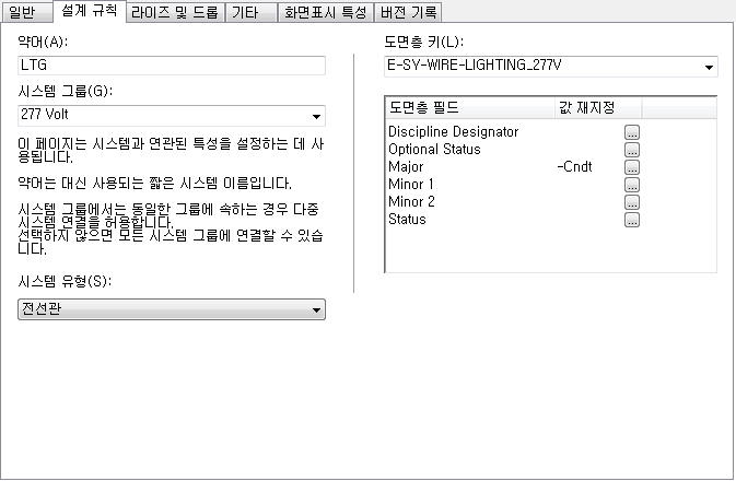| 시스템 유형 | 시스템 유형을 식별합니다. 전기 및 위생 시스템에서만 사용할 수 있습니다. 전원 및 조명과 케이블 트레이는 전기 시스템에서 시스템 유형의 두 가지 예입니다. 모든 전기 시스템에는 지정된 시스템 유형이 있어야 합니다. 온수와 배수는 위생 시스템에서 시스템 유형의 두 가지 예입니다. 위생 시스템은 시스템 유형이 필요하지 않습니다. 그러나 중수나 오수를 사용하는 위생관 시스템은 시스템 유형을 배수로 지정해야 합니다. 이렇게 하지 않으면 위생관 크기 조정 명령이 해당 시스템을 위생관 시스템으로 인식하지 않으므로 파이프 런의 크기를 조정할 수 없게 됩니다. |