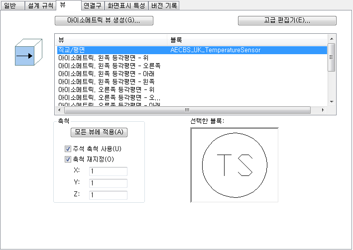 기호 변환 스크립트의 뷰 특성은 스타일 관리자의 뷰 탭에 표시됩니다. 이 탭에서는 ISO 블록 작성 특성을 등각투영 뷰 생성이라고 합니다.