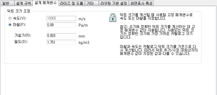 덕트 크기 조정에 대한 계산 방법 지정