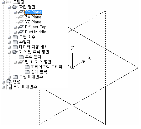 .부품 브라우저에서 작업 평면을 선택하면 모델링 영역에서 해당 작업 평면이 강조표시됩니다.