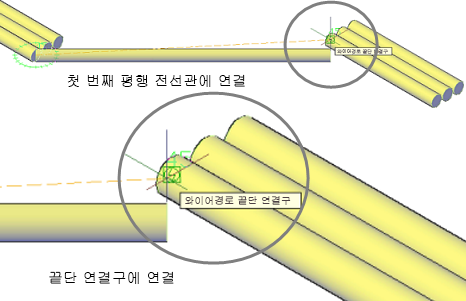 - 평행 전선관 또는 파이프를 선택합니다. 전선관 또는 파이프에서 끝 연결구 점을 선택해야 합니다.