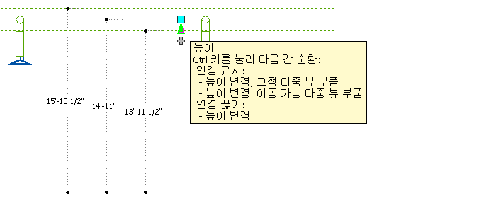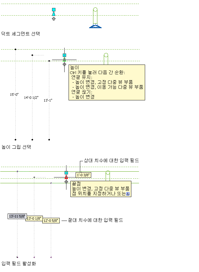 )을 사용하면 측면 및 등각투영 뷰에서 기존 덕트 런에 HVAC 다중 뷰 부품 및 덕트 세그먼트를 연결하면서 그 입면을 수정할 수 있습니다. HVAC 다중 뷰 부품에 있는 입면 그립은 부품의 삽입점과 연결구 점에 표시됩니다. 덕트 세그먼트에 있는 입면 그립을 사용하면 세그먼트의 맨 위, 중심선 또는 맨 아래를 기준으로 입면을 수정할 수 있습니다.