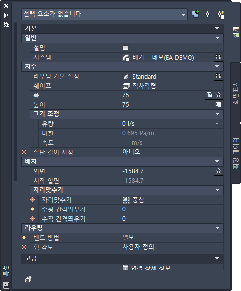 | **그래픽 | 덕트 부속에 베인을 추가할지 여부를 선택합니다. 주: 자세한 내용은 플랙시블 덕트 그리기를 참고하십시오.