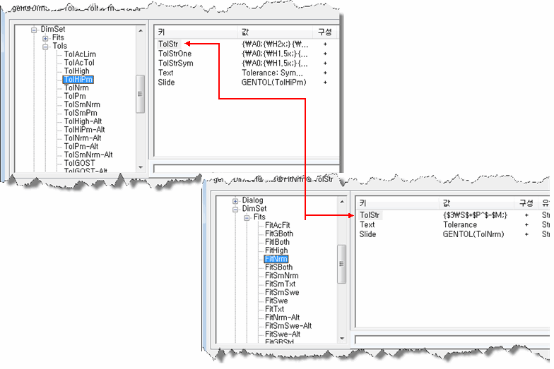 시스템 편집기 항목과 공차 표시 간 대응 관계
